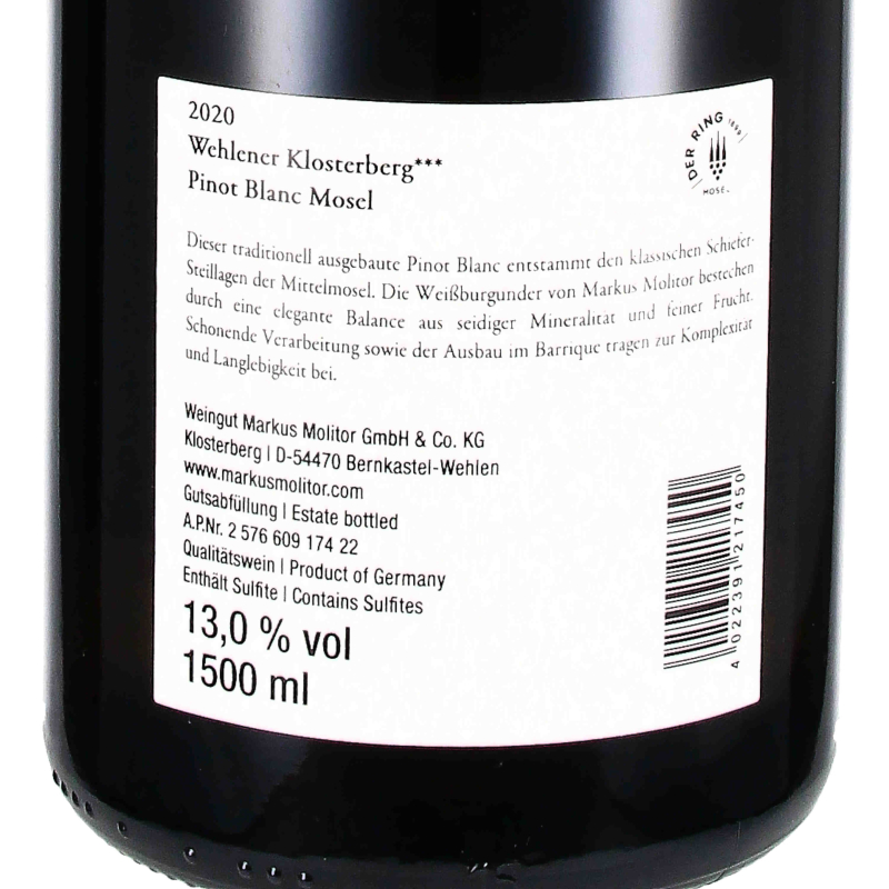 Seit 8 Generationen bewirtschaftet die Familie Molitor Weinberge. Das Weingut hat seinen Sitz leicht erhöht über der Mosel, inmitten der Lage Wehlener Klosterberg und mit Blick auf die Zeltinger Weinberge. Haus Klosterberg Das Weingut Markus Molitor ist derzeit mit 38 Hektar Rebfläche (davon 4,5 ha an der Saar) das größte Weingut an der Mittelmosel. Es hat sich mit einem Anteil von 95% Riesling, 3% Spätburgunder und 2% Weißburgunder ausschließlich drei, auch an der Mosel mit Tradition verbundenen, Edelrebsorten verschrieben. Die Jahresproduktion bewegt sich je nach Jahr zwischen 200.000 und 300.000 Flaschen (zu über 90% auf 0,75 l). Hinzu kommen etwa 20.000 Flaschen im eigenen Weingut produzierter Sekt.